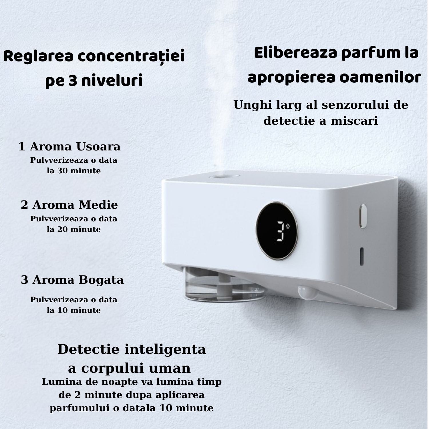 Senzor de mișcare inteligent: detectează prezenta umana și eliberează automat parfumul timp de 4 secunde, la fiecare 10 minute, oferind prospețime doar atunci când este nevoie – ideal pentru economie și eficienta.